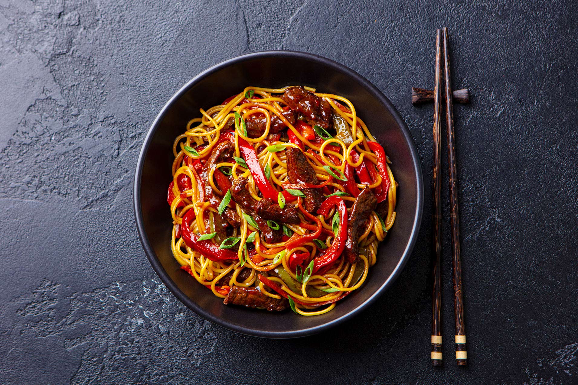 Nouilles chinoise sautées au bœuf et légumes.